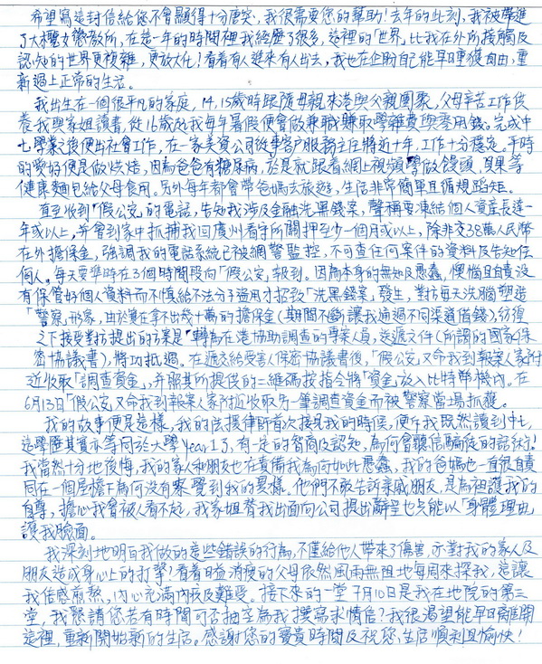 I hope this letter does not come across as abrupt, but I am in desperate need of your help. This time last year, I was remanded to Tai Lam Centre for Women. Over the past year, I have gone through so much; the world here is far more convoluted and amplified than anything I ever encountered or understood outside these walls. Watching people come and go, I constantly pray for the day I can regain my freedom and return to a normal life.