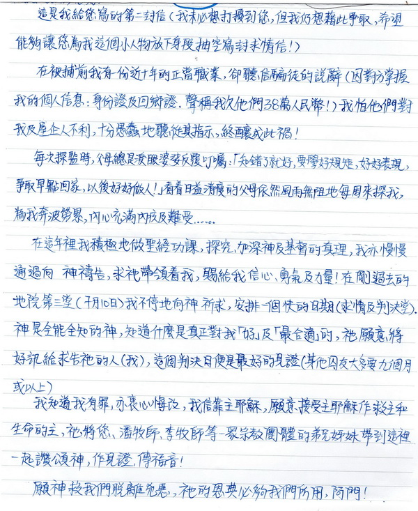 God's and Christ's truths. I have also gradually turned to praying to God, asking Him to guide me and grant me faith, courage, and strength. During my third hearing at the District Court just recently (on July 10), I prayed constantly to God, asking Him to arrange an early date for my mitigation and sentencing hearing.