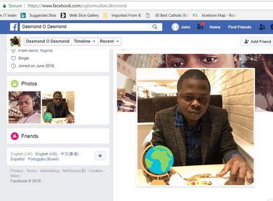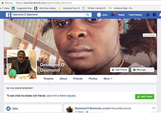 Desmond (Ogbemudia? Ebhonun?) lives 8/F of Lucky House (Cnr Jordan/Nathan Rds..Exit B of Jordan MTR)...at lift on 8/F don't go left or right, but straight ahead...to unit with glass door...has subdivided rooms...in one of which Desmond lives with another Nigerian man. Desmond is short; other man tall. Desmond was arrested on marijuana charge in 2014-2015...was in LCK about a year....granted bail ....then acquitted? Desmond visited his cohort ..... in Stanley, Nov 2017 to Feb 2018.