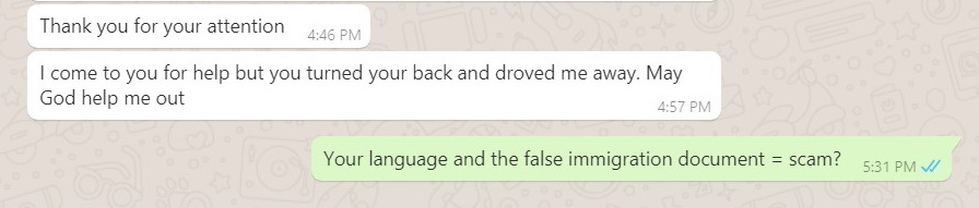 On the night of Monday June 22, in a phone call to me, Emma would not reply to my question "Why was Immigration paper doctored?" ... he just kept asking for the money. Conversation did not last long. At no stage in this or previous calls was he impolite or threatening.